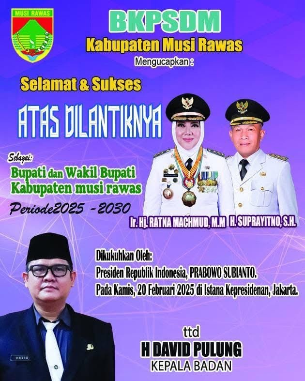 BKPSDM Musi Rawas Mengucapkan Atas Pelantikan Bupati dan Wakil Bupati Musi Rawas Hj.Ratna Machmud dan H.Suprayitno