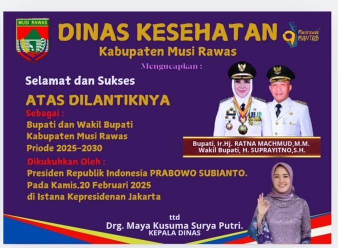 Beranda Musi Rawas Dinas Kesehatan Musi Rawas Mengucapkan Selamat Atas Dilantiknya Hj. RATNA Machmud dan H. Suprayitno Bupati Musi Rawas Periode 2025 - 2030