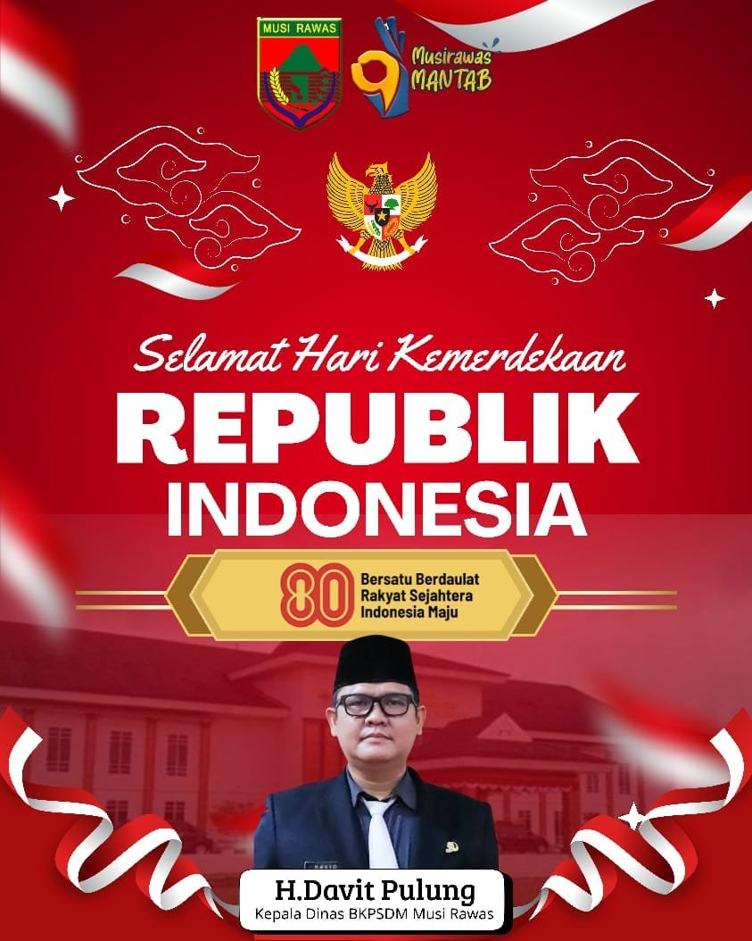 Kepala BKPSM Musi Rawas Mengucapkan HUT Republik Indonesia ke-80 admin17/08/202529/07/2025123 Dilihat Kepala BKPSDM Musi Rawas H. DAVID Pulung Post Views: 123 Pos terkaitHadiri Pembukaan HKG PKK Ke-54 dan Rakerda Dekranasda Sumsel Bupati Musi Rawas Hj Ratna MachmudMusrenbang Kabupaten Penyusunan RKPD Tahun 2027 Dibuka Wakil Bupati H. SuprayitnoPemerintah Kabupaten Musi Rawas Menggelar Buka Puasa Bersama Pendopoan Rumah Dinas BupatiBupati Hj. Ratna Machmud Lantik Pejabat Eselon II di Lingkungan Pemkab Musi RawasWabup H. Junius Wahyudi Hadiri RUPS Tahunan dan RUPS Luar Biasa PT Bank Sumsel BabelAr.Dion Hary Kader GP Ansor Musi Rawas Terima Penghargaan Sebagai Arsitek Gedung Aswaja Center