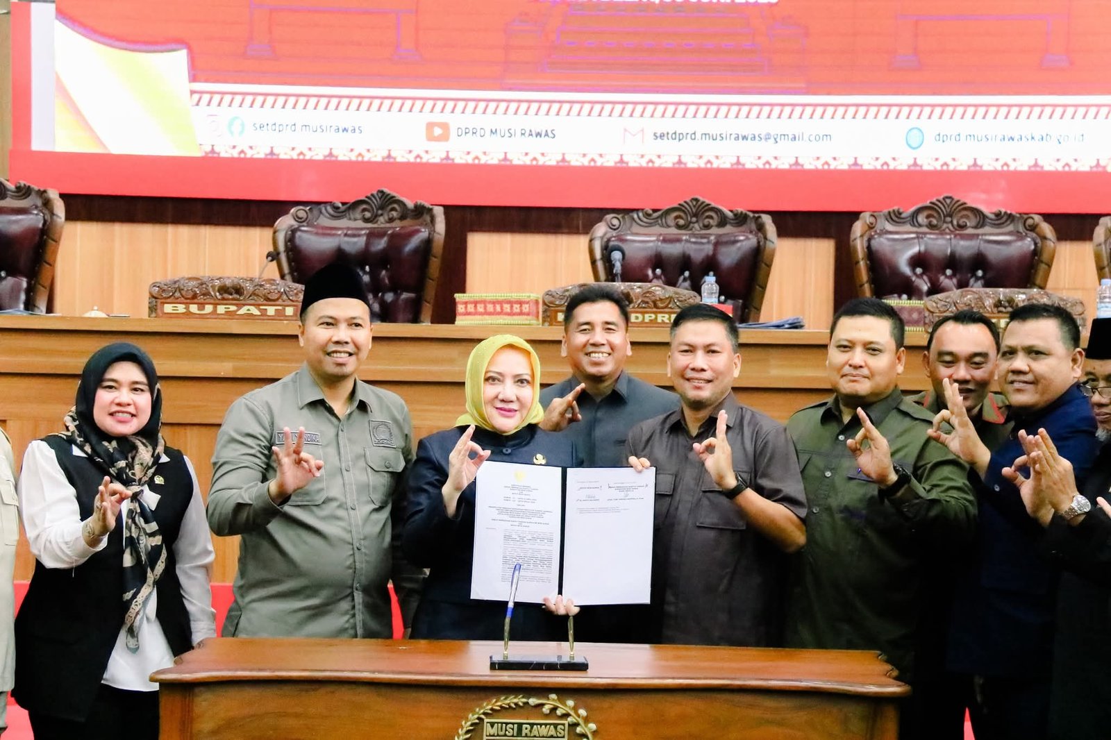 Penandatanganan berita acara pengesahan dilakukan oleh Wakil Ketua II DPRD Apt Yani Yandika Saputra bersama Bupati Musi Rawas, Hj. Ratna Machmud.