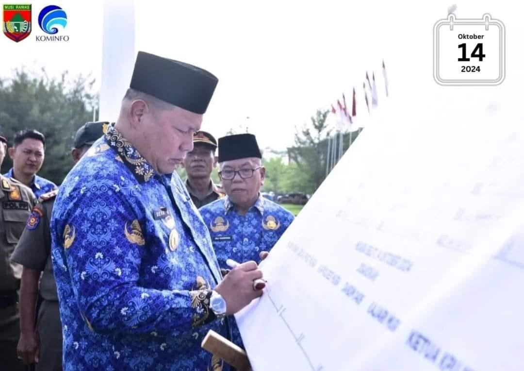 TEBARKAN.COM – MUSI RAWAS – Apel Pagi Bersama dan Penandatanganan Pakta Integritas Netralitas bagi ASN Pemerintah Kabupaten Musi Rawas pada Pilkada Serentak Tahun 2024 di Halaman Kantor Bupati Musi Rawas, Senin (14/10/2024).