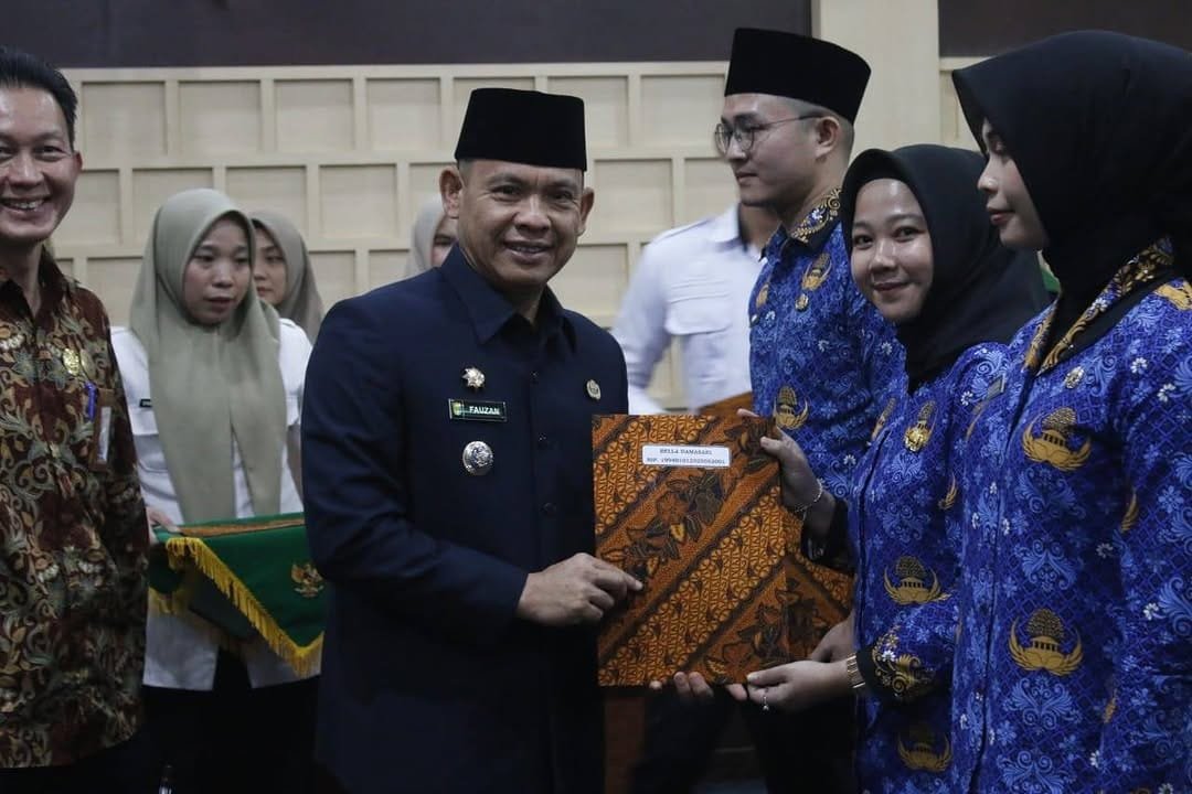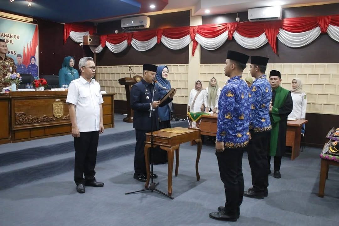 TEBARKAN – EMPAT LAWANG – Penjabat Bupati Kabupaten Empat Lawang Fauzan Khoiri, AP., MM, secara resmi mengukuhkan dan menyerahkan Surat Keputusan (SK) Calon Pegawai Negeri Sipil (CPNS) formasi tahun 2024 dan pengambilan sumpah PNS dilingkungan pemerintah Kabupaten Empat Lawang tahun 2025, bertempat di Ruang Rapat Madani, Sekretariat Daerah Kabupaten Empat Lawang, Kamis (5/6/2025).