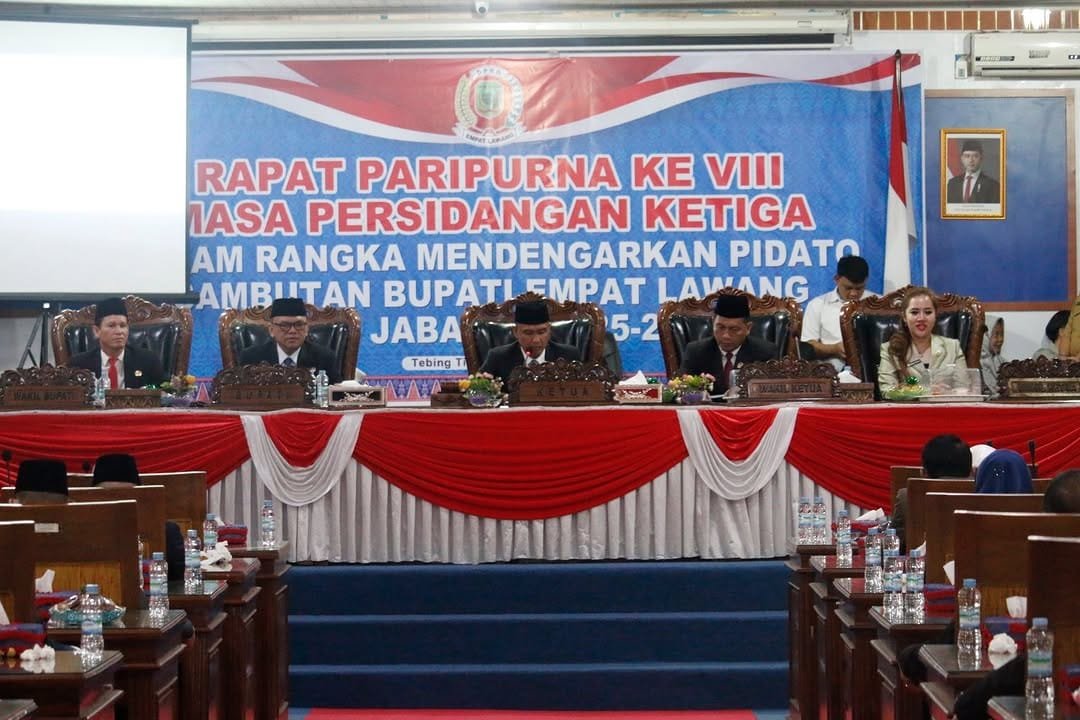 TEBARKAN – EMPAT LAWANG – Dewan Perwakilan Rakyat Daerah (DPRD) Kabupaten Empat Lawang menggelar Rapat Paripurna ke-VIII masa persidangan ke-3 tahun sidang 2025 dalam rangka mendengarkan pidato sambutan Bupati dan wakil Bupati Empat Lawang masa jabatan 2025–2030, Dr. H. Joncik Muhammad, S.Si., S.H., M.H., M.M., dan Arifa’i, SH, di ruang rapat utama DPRD, Senin (30/6/2025).