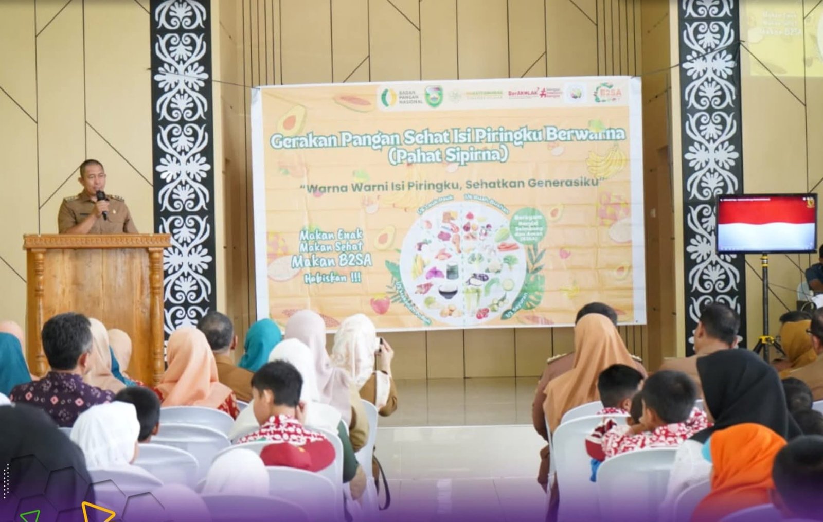 TEBARKAN – PAGAR ALAM – Wali Kota Pagar Alam, Ludi Oliansyah didampingi Ketua TP-PKK Hera Parianti Ludi, menghadiri kegiatan Sosialisasi dan Edukasi Gerakan Pangan Sehat “Isi Piringku Berwarna” dan B2SA Goes to School, yang dilaksanakan di Aula Kantor Kecamatan Dempo Tengah, Kota Pagar Alam, Selasa (19/08/2025).